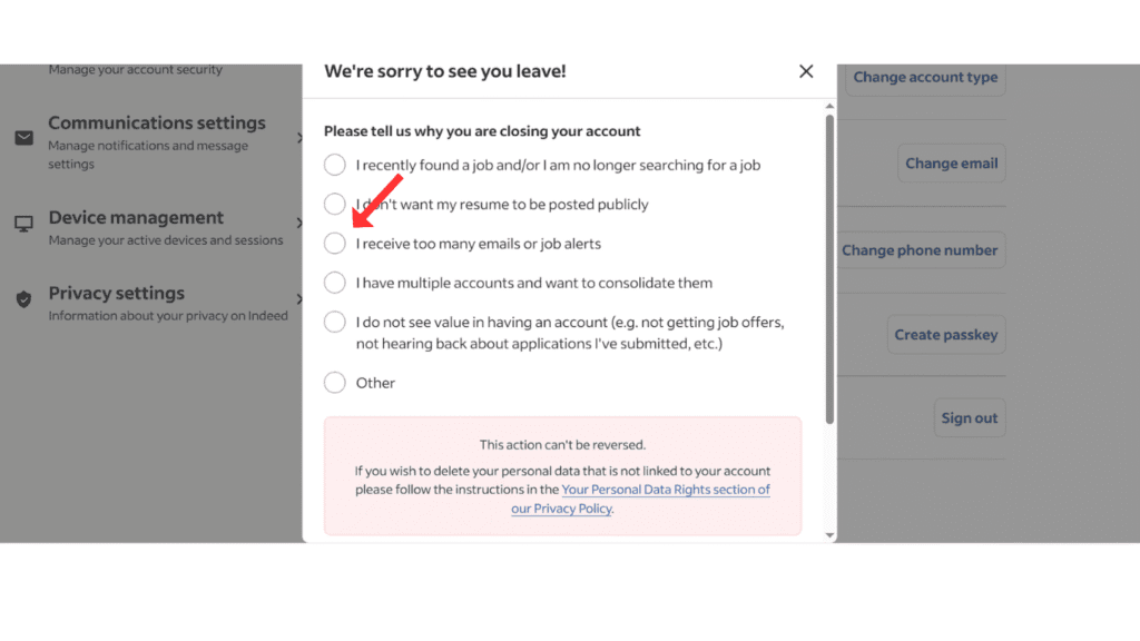 - Click on Close My Account in the Indeed account.