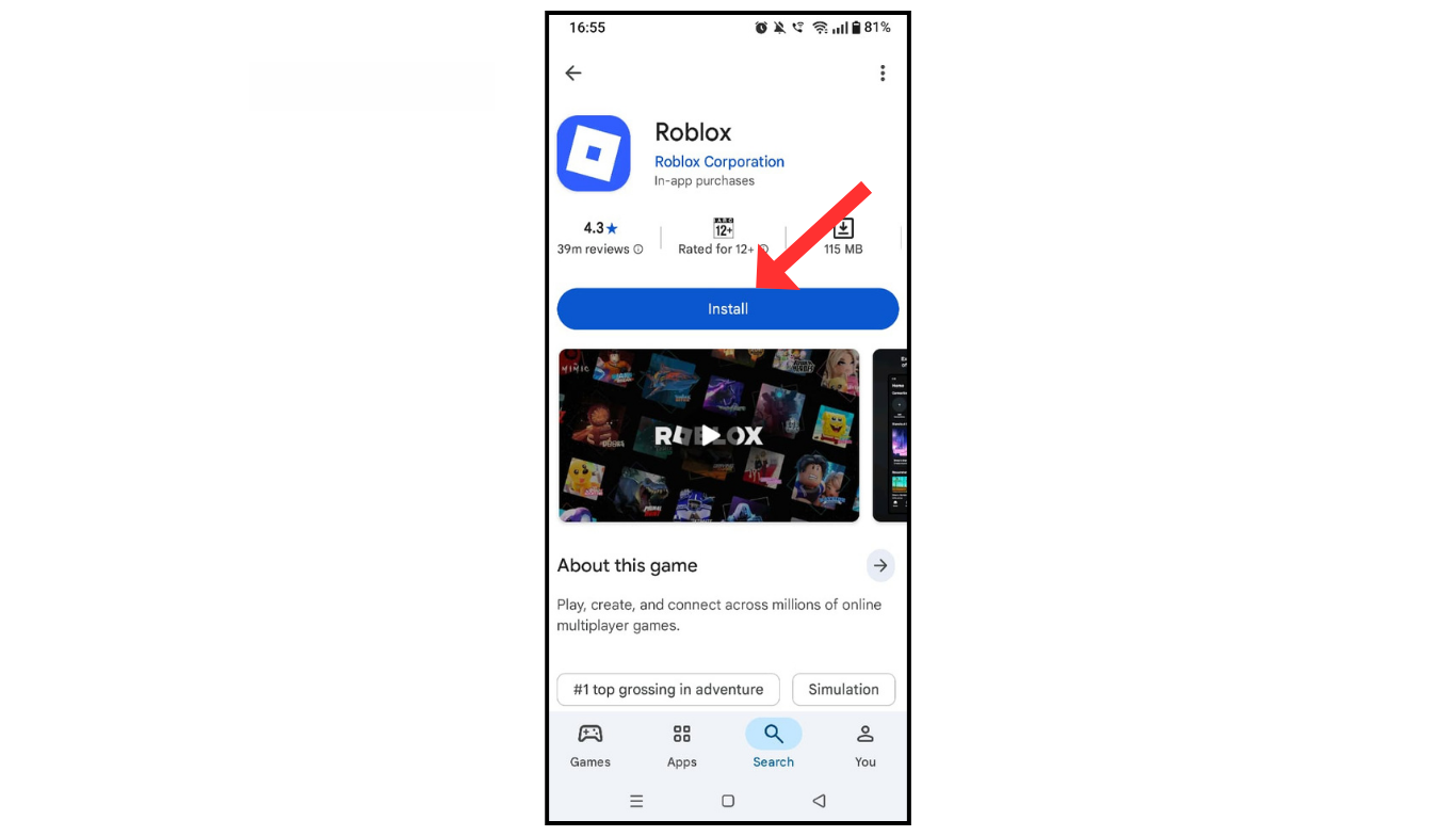 - Open the Play Store app and click on install Roblox.